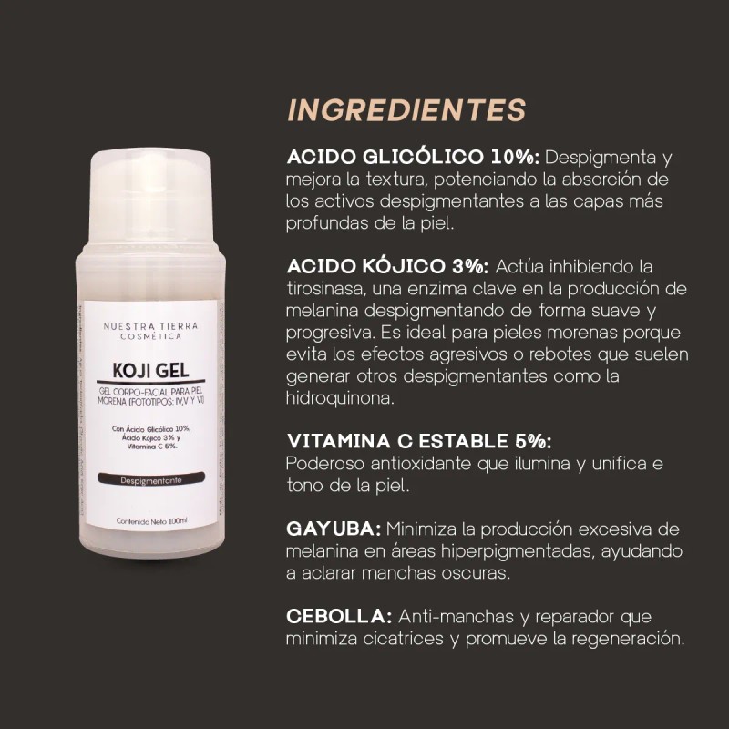 El Gel Despigmentante con Ácido Kójico de Nuestra Tierra Cosmética ha sido especialmente desarrollado para tratar y mejorar la apariencia de la piel morena y latina, que tiende a presentar manchas más persistentes por su alta concentración de melanina.