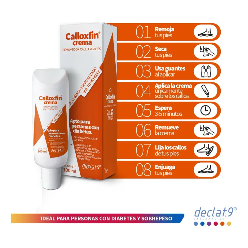 •Recomendamos remojar los pies previamente en agua, secar parcialmente. Usando guantes aplicar Calloxfin de forma abundante sobre la callosidad, dejar reposar de 5 a 7 minutos, remueva el producto con una toalla húmeda y la callosidad se desprenderá completamente. Finalmente enjuague los pies para retirar el excedente de producto
