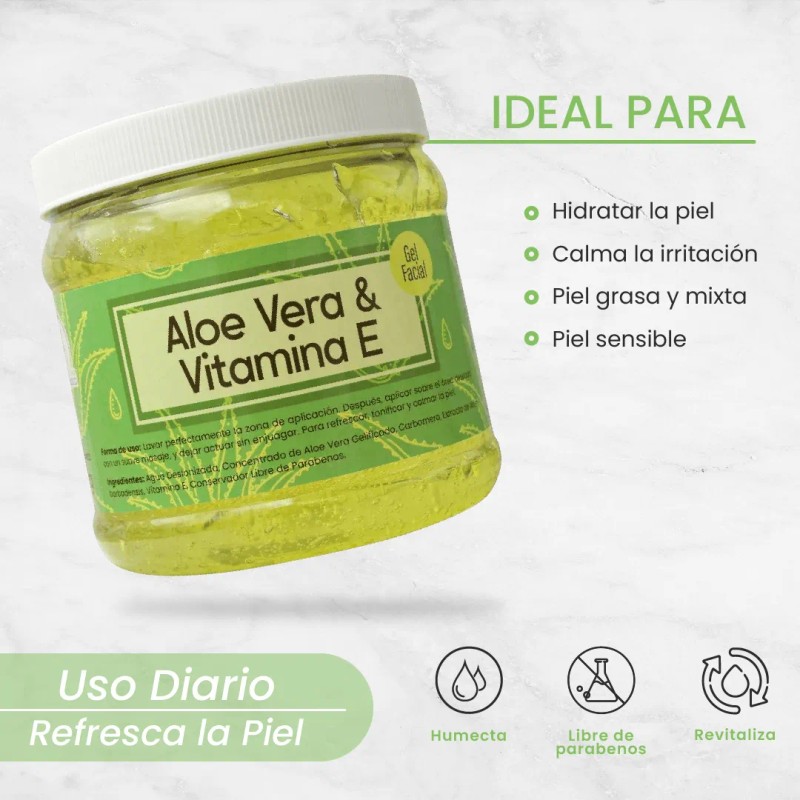 Gel Facial de Aloe Vera con Vitamina E, 1 Kg. Hidratante y antioxidante. Día/Noche. Todo tipo de piel. Calma, repara y rejuvenece. ¡Piel radiante y suave!