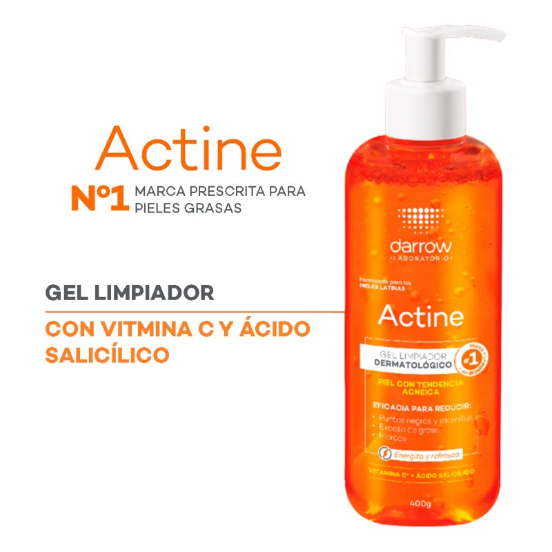 Aquí tienes las descripciones para tu Gel Limpiador Dermatológico Darrow Actine Vitamina C de 400g, diseñado para piel grasa y para uso de día y noche.