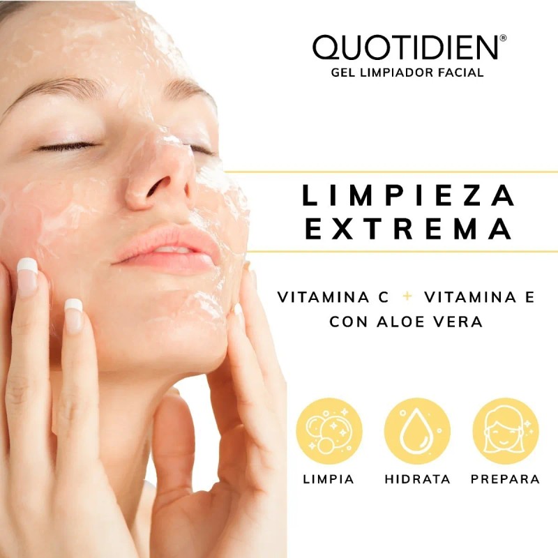 - El Gel Limpiador Facial Quotidien ofrece una limpieza profunda y suave gracias a su fórmula enriquecida con ingredientes naturales. Este producto está diseñado para dejar la piel suave e hidratada tras cada uso. Contiene extracto de Kakadu, conocido por su alta concentración de Vitamina C, que, junto con el Aloe Vera y la Vitamina E, ayuda a prevenir irritaciones y proporciona beneficios visibles, dejando la piel limpia y radiante. Es ideal para iniciar cualquier rutina de cuidado facial. Beneficios: