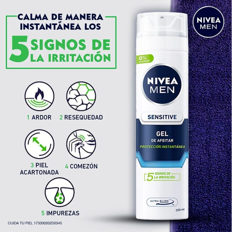 Descripción Limpia: NIVEA MEN Gel de afeitar Sensitive está diseñado para proteger la piel de la irritación, siendo ideal para quienes tienen piel sensible. Este gel protege instantáneamente contra los cinco signos más comunes de irritación del afeitado, incluyendo enrojecimiento, tirantez y micro cortes.