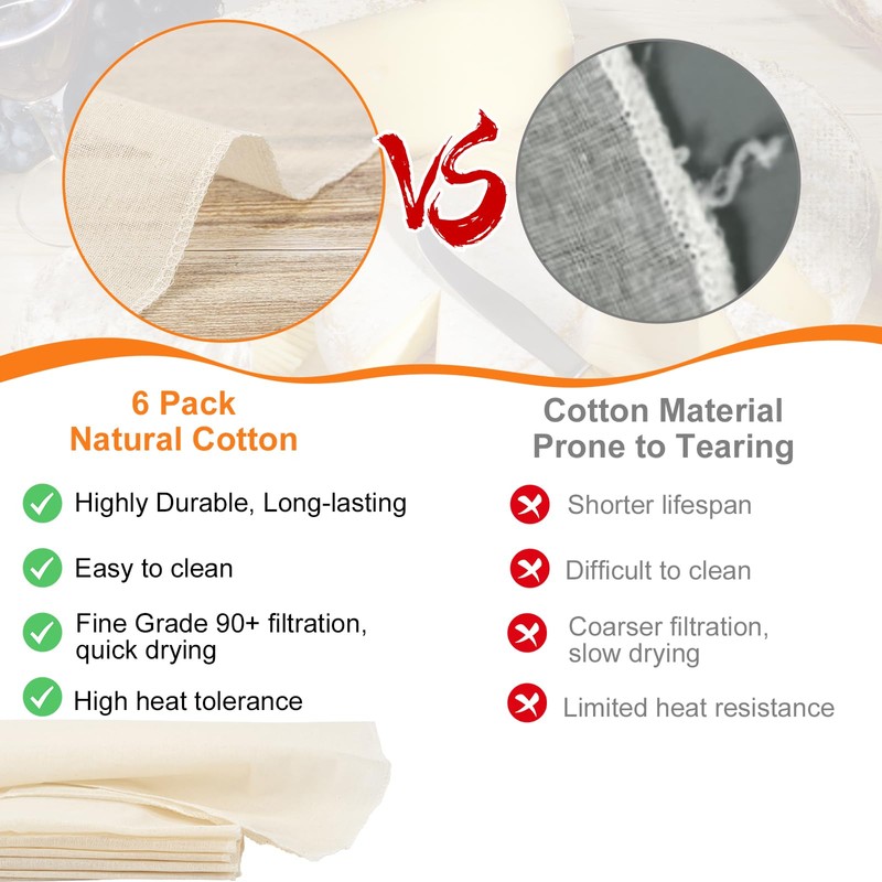 - 6 Value Pack - Food-grade cotton cheese cloth (20x20 inches) with a tight weave for filtering most foods. Tips: Wash before use, not for oven/microwave, boilable, reusable