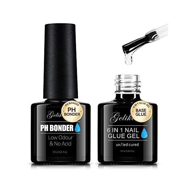Gelike EC 6 in 1 Nail Gel Glue Base and Prep PH Bonder Dehydrator Gel Nail Kit 2PCS for Nail Polish, Base Glue Acid-Free Primer,Super Shiny Stain Resistant for False Tips