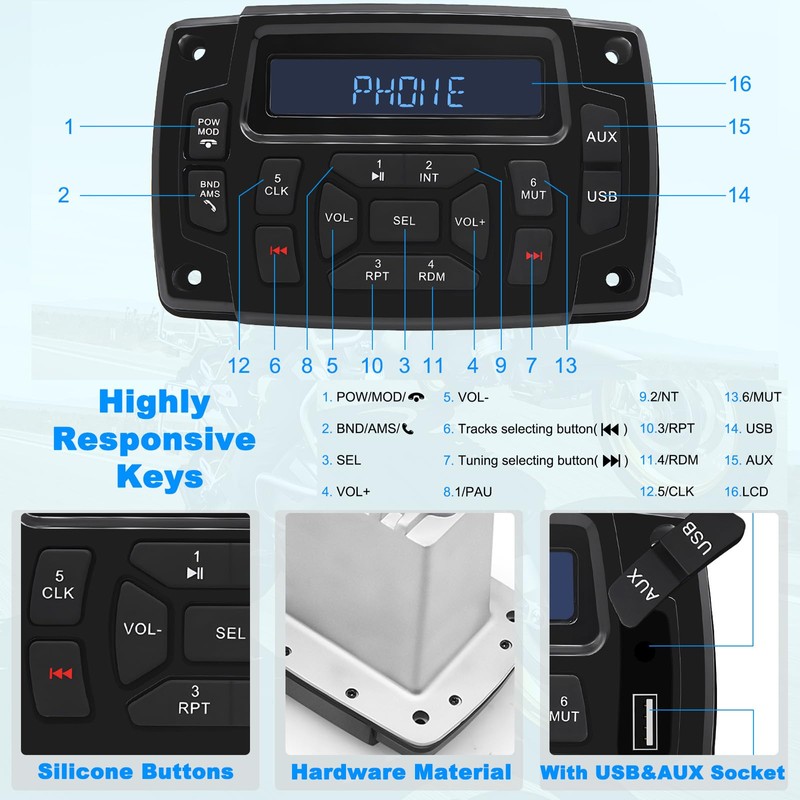 - BETTER MUSIC EXPERIENCE: Marine stereo receiver features stereo surround sound quality and supports free selection of BAS/LOUD/RTC.OFF functions, allowing you to enjoy high-quality lossless music and immerse yourself in the world of music