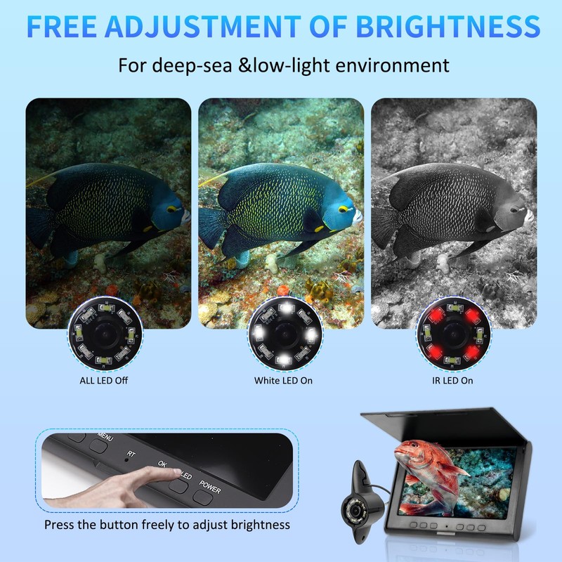 - ENHANCED VISIBILITY WITH IR LIGHTS:Equipped with 6 IR lights,this fishing camera offers excellent visibility in dark or murky waters. It allows you to easily spot and track fish, enhancing your fishing success during nighttime adventures.Easily adjust lighting with the simple "IR" button.Unlike other cameras,the IR light is invisible to fish, letting you see clearly in deep or murky waters without scaring them off (note: infrared LED light up when the image is a black-and-white display at night)