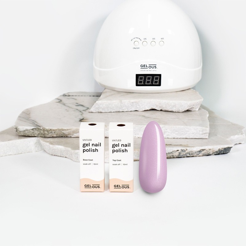Apply Gelous Base Coat, Gelous Builder Gel (optional), Gelous Colour Coat, then Gelous Top Coat, curing each coat with the Gelous UV/LED Gel Nail Lamp for a strong gel manicure that lasts over two weeks!