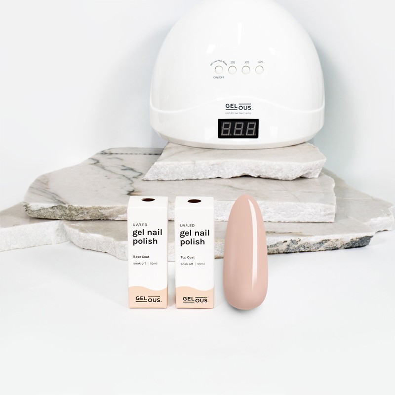 Apply Gelous Base Coat, Gelous Builder Gel (optional), Gelous Colour Coat, then Gelous Top Coat, curing each coat with the Gelous UV/LED Gel Nail Lamp for a strong gel manicure that lasts over two weeks!