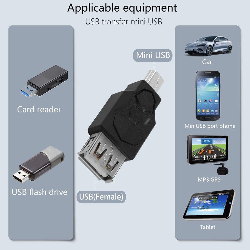 - General compatibility: USB 2.0 to 5pin mini USB adapter, is ideal for digital cameras MP3, MP4, mobile phone etc. Compatible with most mini USB devices.