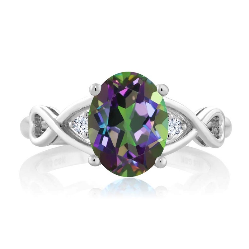 - Stunning 1.85 Cttw Green Mystic Topaz & White Topaz 3-Stone Ring: This beautiful ring features a 9X7MM oval Green Mystic Topaz as the centerpiece, accented by sparkling 1.8MM round White Topaz stones, delivering a captivating and unique look.