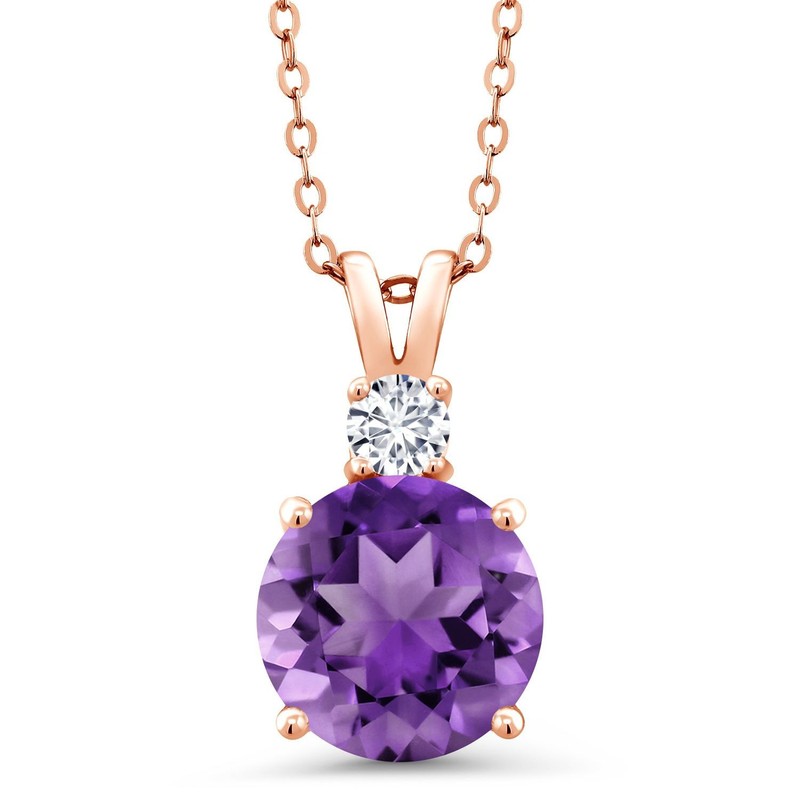 18K Rose Gold Plated Silver Purple Amethyst and White Lab Grown Diamond Pendant Necklace For Women (3.52 Cttw, Gemstone February Birthstone, Round 10MM, with 18 Inch Chain)
