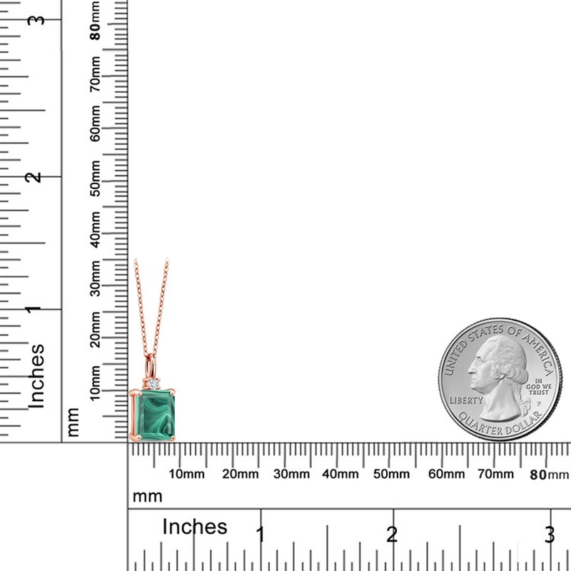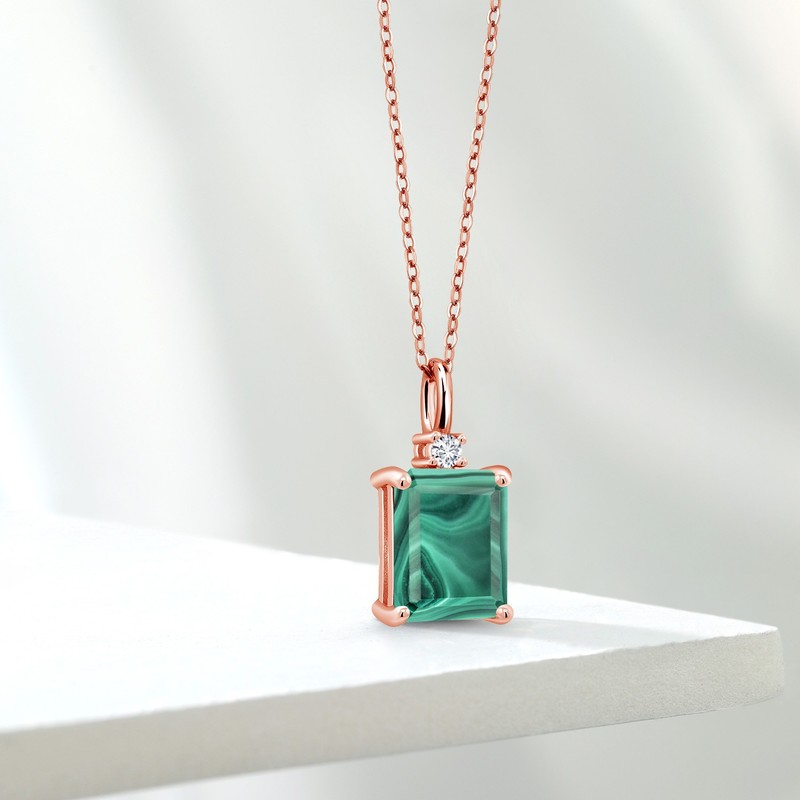 18K Rose Gold Plated Silver Green Malachite and White Lab Grown Diamond Pendant Necklace For Women (5.04 Cttw, Gemstone Birthstone, Emerald Cut 10X8MM with 18 Inch Silver Chain)