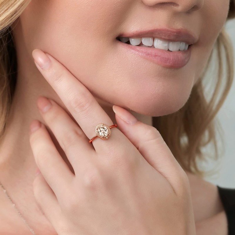 - MEASUREMENTS: 8x6mm Oval Irradiated Peach Morganite, 1x1mm Round White Diamond. Total Carat Weight is 1.01 cttw
