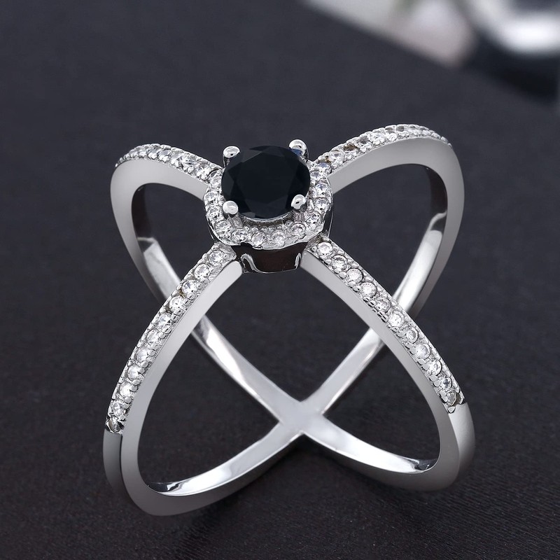 Gem Stone King 925 Sterling Silver Black Onyx Criss Cross X Ring For Women (1.29 Cttw, Round 5MM, Gemstone Birthstone, Available In Size 5, 6, 7, 8)