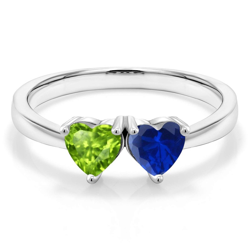 Gem Stone King 925 Sterling Silver Double Heart Shape Green Peridot Blue Created Sapphire Ring For Women (1.11 Cttw, Gemstone Birthstone, Available In Size 5, 6, 7, 8, 9)