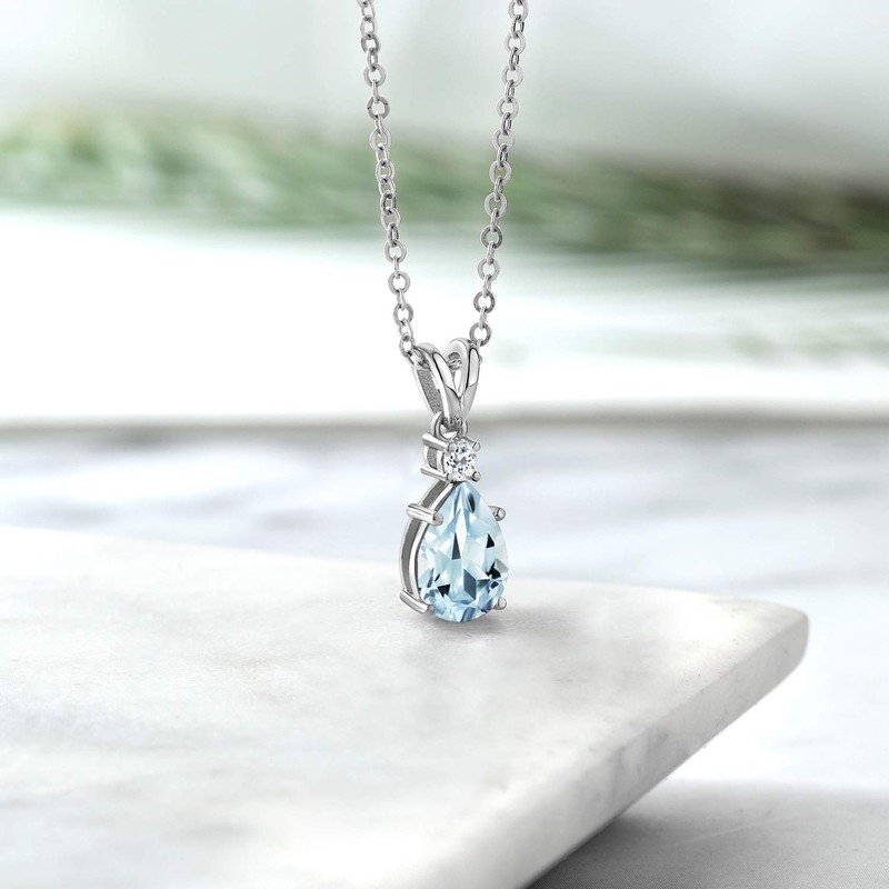 Gem Stone King 925 Sterling Silver Sky Blue Aquamarine and White Topaz Pendant Necklace For Women (1.24 Cttw, Gemstone March Birthstone, Pear Shape 9X6MM, with 18 inch Chain)