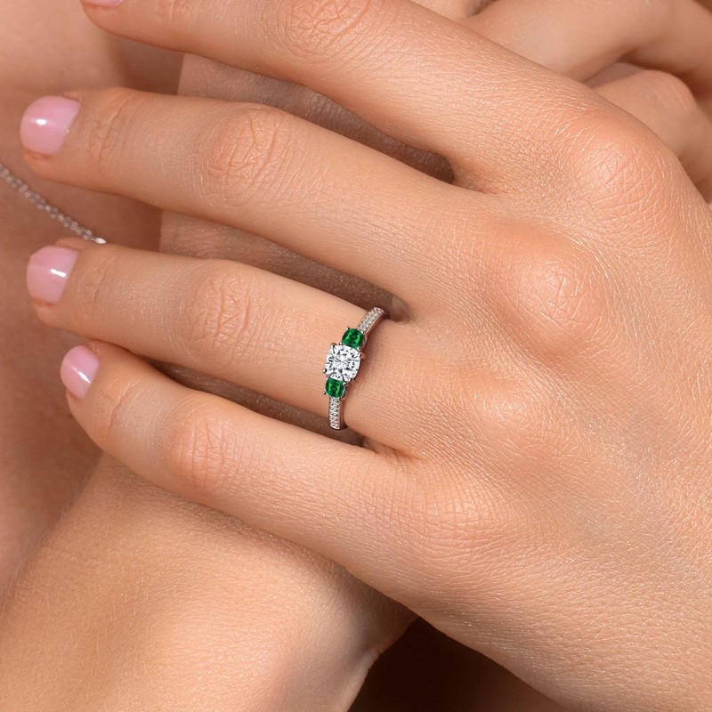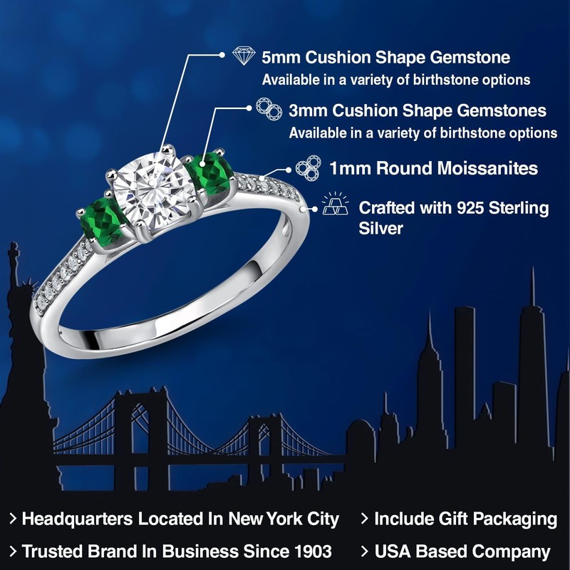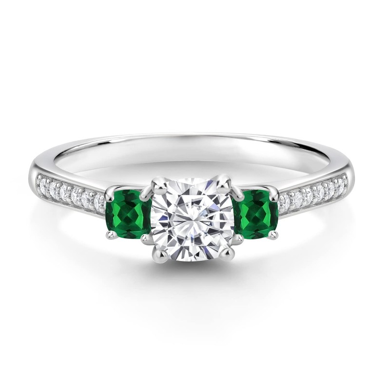 - Exceptional Quality and Craftsmanship: This exquisite engagement ring features a total of 1.04 Cttw, showcasing a stunning 5MM cushion-cut white moissanite at the center, flanked by two 3MM green nano emeralds. Crafted from high-quality 925 sterling silver, this ring ensures durability and a brilliant finish, making it a timeless addition to any jewelry collection.