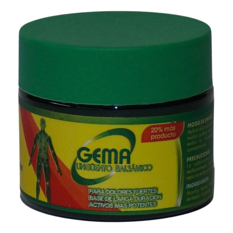 Gema Ungüento Balsámico es un remedio tópico que alivia la congestión respiratoria, calma la tos y dolores musculares leves. Contiene ingredientes como alcanfor, mentol y eucalipto para un efecto descongestionante y reconfortante. Aplique en pecho, garganta o músculos.