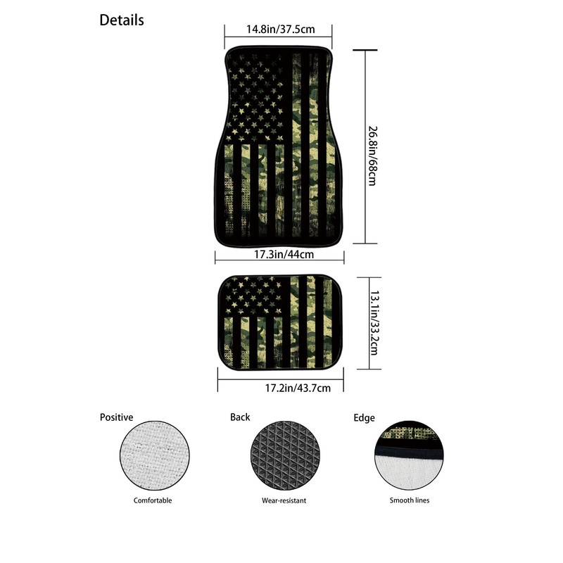 - UNIVERSAL FIT: Our decorative American flag with grunge camouflage floor mats for cars with general size include 2 front mats and 2 rear mats, universal fit for all seasons for most cars, SUV, trucks, van and sedans; Please check the dimensions before purchasing