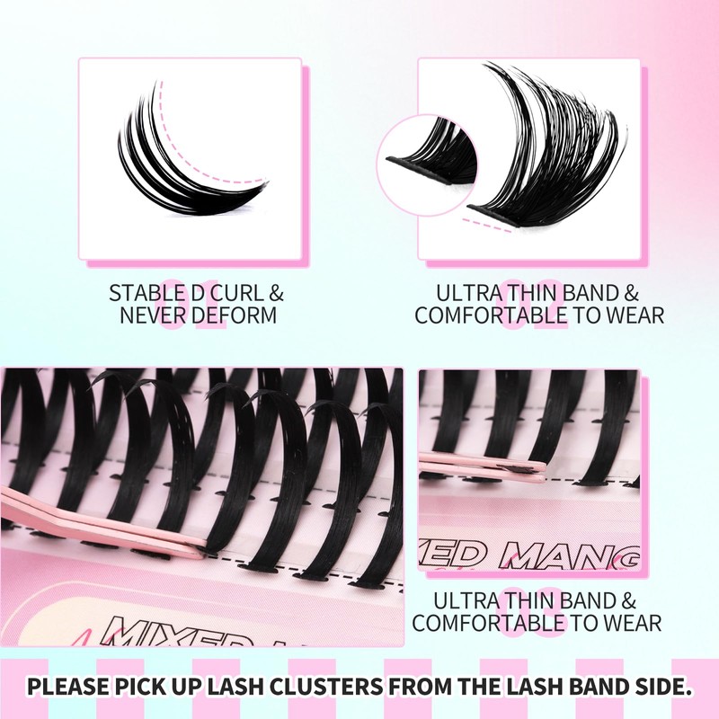 - Manga eye: the individual manga eyelashes and long and thick 100D eyelash clusters are stable clusters. When overlaid together, they give you a dramatic style and for thorny fairy advice on the Russian bands. If you want a beautiful look, it is the one for you; the shape and design of thorny eyelashes offer endless possibilities to create daring and catchy look