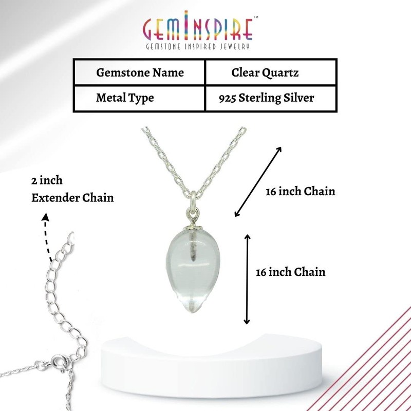 GemInspire Natural Clear Quartz Dew Drops Pendant Necklace, April Birthstone, 10 x 15 mm Drop With 16 + 2 Inch 925 Sterling Silver Adjustable Chain (Clear Quartz)
