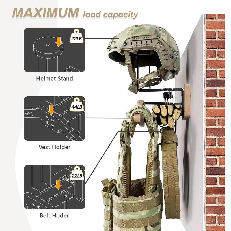 - [Durable Construction] Crafted from sturdy carbon steel and wood, our Helmet Stand features an expanded frame design, ensuring robust durability and a remarkable load capacity of up to 80LBS. Safely store your helmet (20LBS), vest (40LBS), and belts (20LBS) without any worry.