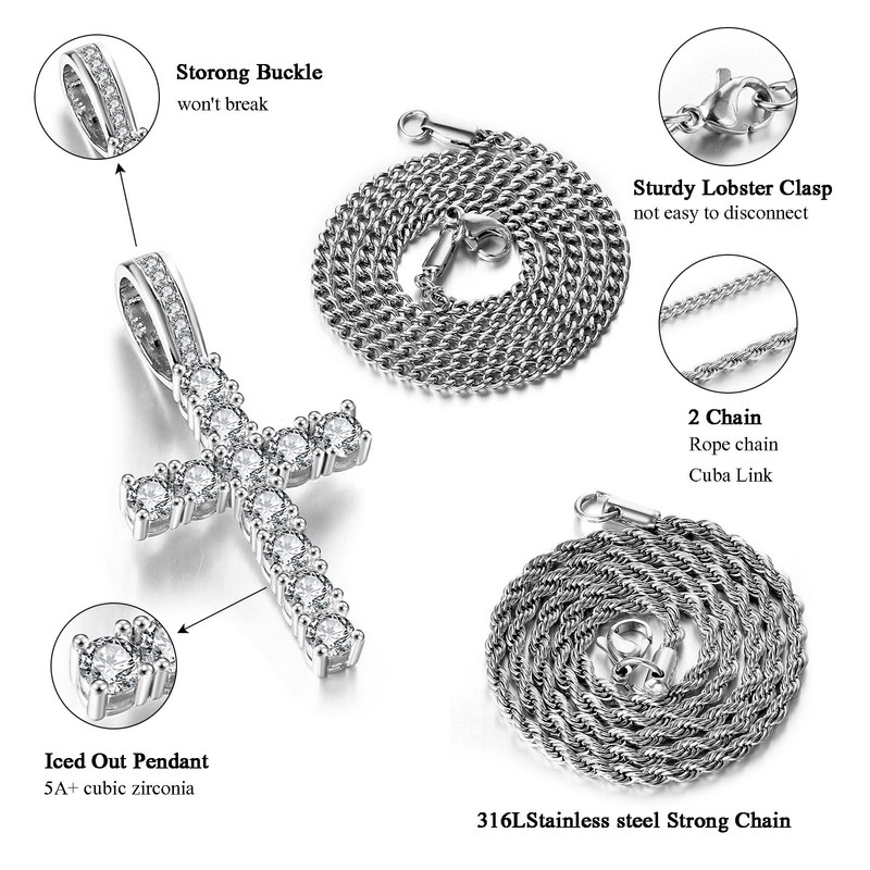 - 【CROSS CHAIN SIZE】Cross pendant length 1.65”, width 0.83”. To get a glistened iced out pendants, we use 4 prong setting which will cost much more than the labor’s. Rope chain length 18 inches, cuban link length 16 inches, width 3mm, you can choose the chain length suitable for you. The Firm Clasp connects the cross pendant and chain, which is not easy to fall off. Strong chains can be used for many years and are not easy to break.