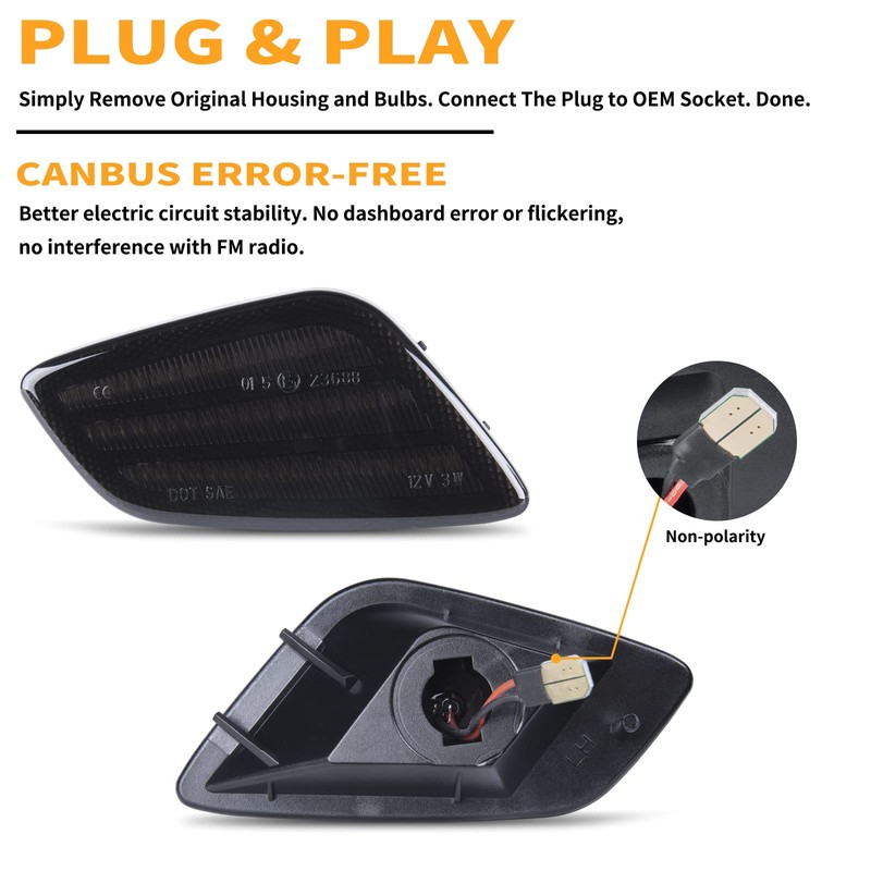 • EASY INSTALLATIOIN: Plug and play, no wiring or modification, no damage to the original housing. Simple upgrade only in 15 minutes or less. Perfect replacement for the OEM side marker light.