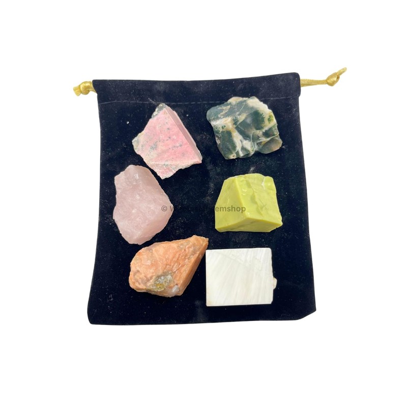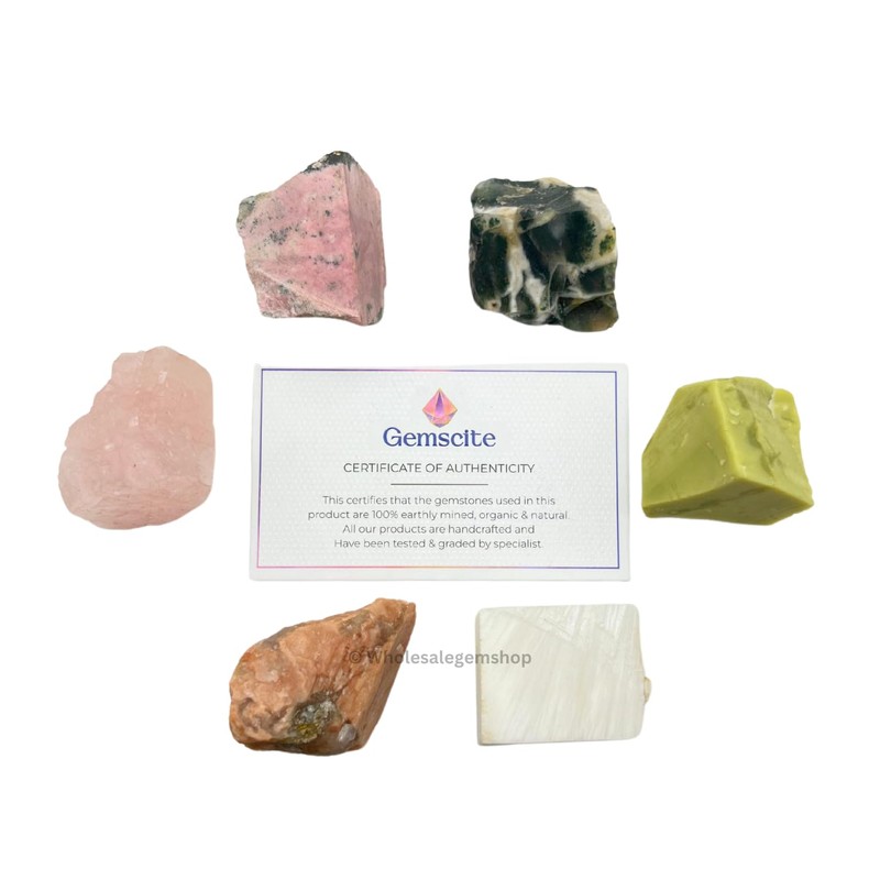 - Authentic raw healing crystals and stones includes Rose Quartz, Rhodonite, Peach Moonstone, Serpentine, Scolecite and Moss Agate.