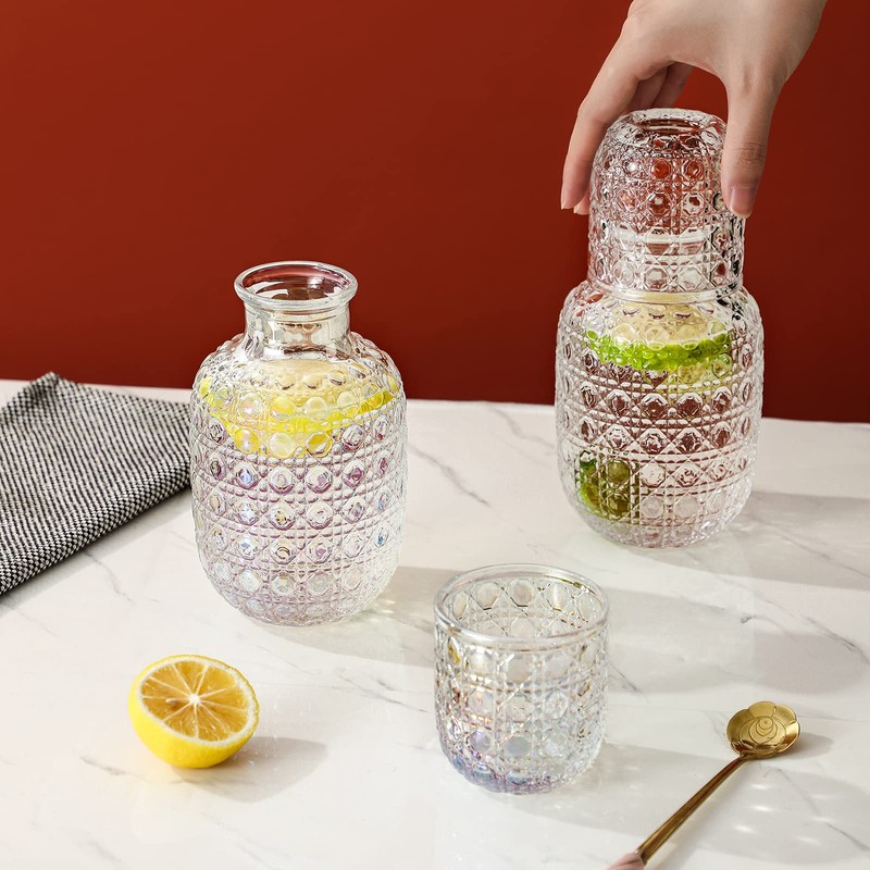- This bedside water carafe iridescent is designed with special gem engraving and it looks elegant and cute with its round shape. There are two colors for your choice. Please note that the Iridescent color is not dishwasher safe. The clear color is dishwasher safe.