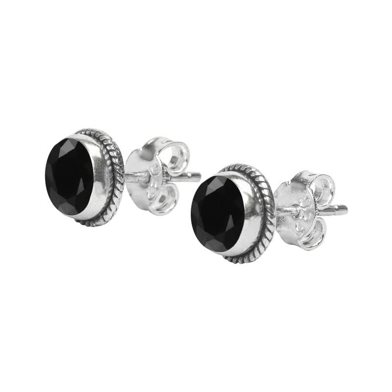 Gemstone Stud Earrings in 925 Sterling Silver | Natural 6MM Gemstones - Amethyst, Onyx, Citrine, Moonstone | Hypoallergenic Jewelry (Black Tourmaline)
