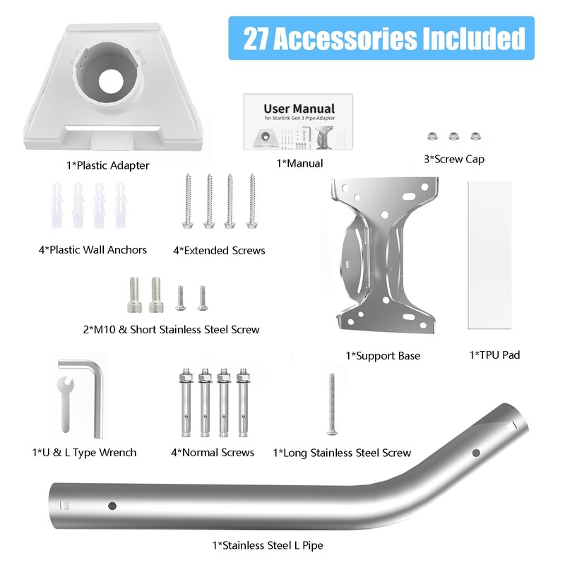 - 【Service Assurance】What's in the package: 1*Plastic Adapter, 1*Support Base, 1*TPU Pad, 2*Wrench, 4*Plastic Wall Anchors, 1*Manual, 3*Screw Cap, 1*Stainless Steel Pipe,and all necessary screws for installing the starlink wall mount. We provide timely support both before and after your purchase. If any assistance required, please do not hesitate to let us know. we will offer reliable solution within 24 hours.