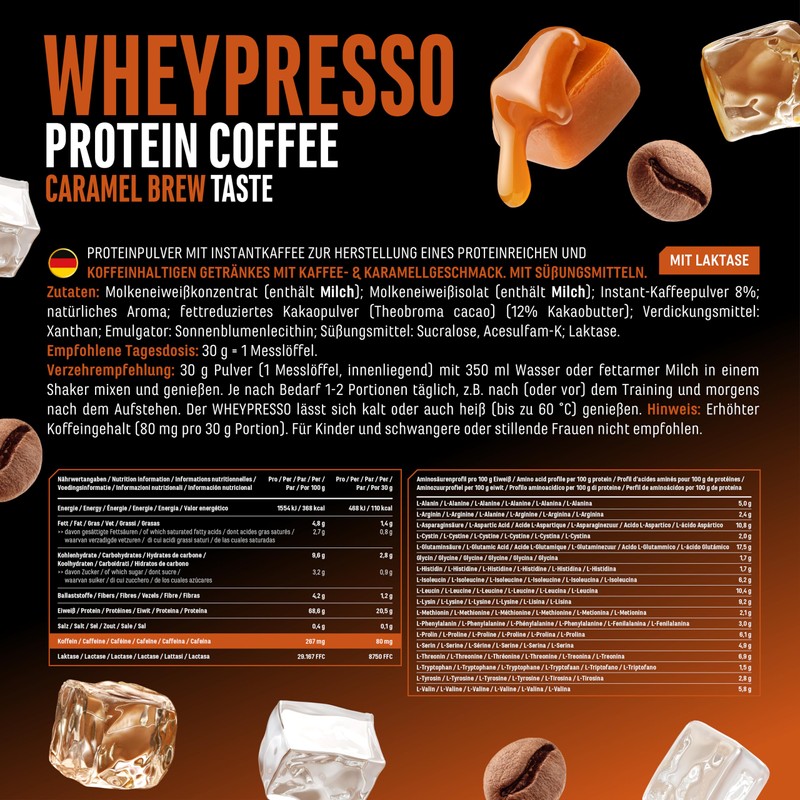 - 2-IN-1 KOMBINATION: Wheypresso Caramel Flavour kombiniert zwei erstklassige Proteinquellen, Whey Protein Konzentrat und Whey Protein Isolat mit echtem Kaffee, um einen k?stlichen Proteinkaffee zu kreieren. Perfekt f??r Fitness-Enthusiasten und Genie?er zugleich.