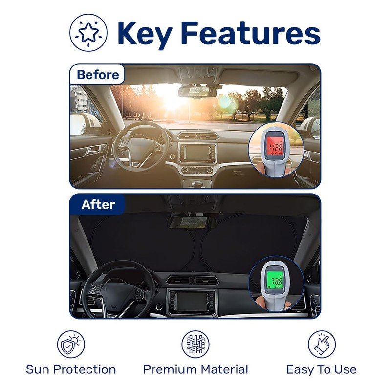 - HIGH-QUALITY MATERIAL: Our sturdy car shade front windshield is constructed from high-quality double-insulated laminate. The accordion-type windshield shade is made of reflective aluminum foil that protects you from harmful UV rays effectively.