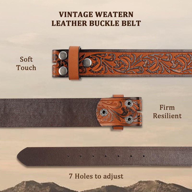- Design: Cowboy men's belts feature a retro design, are made of selected premium top layer cowhide, and have a tough and glossy texture. Western cowboy men's belts feature removable buckle metal rivet elements. You can replace cowboy bukcle with your favorite western totem according to your personal preferences and style.