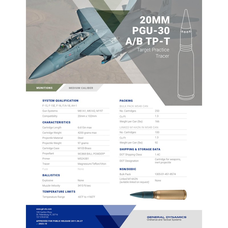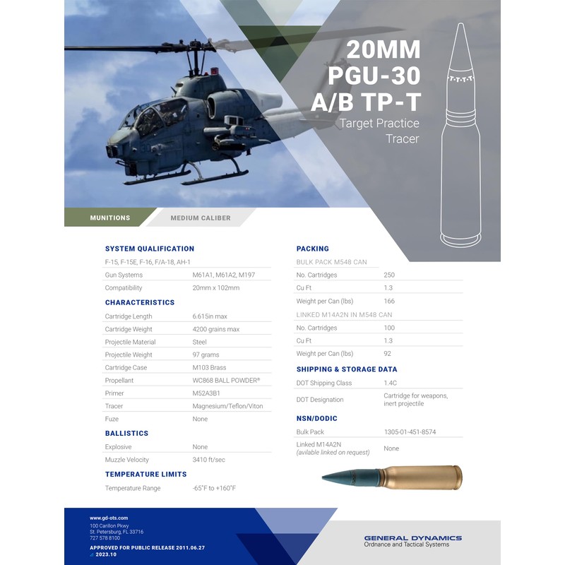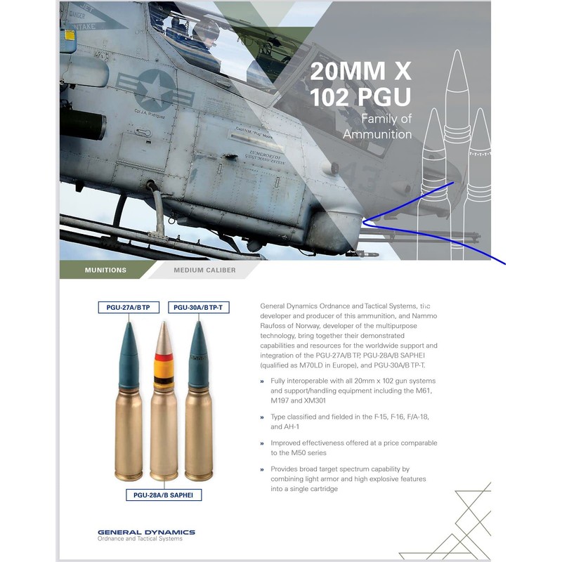 • Fired by the M61 Vulcan 20mm Gatling Gun on the F14 * F15 * F16 * F18 * F22 * CRAM * CIWS