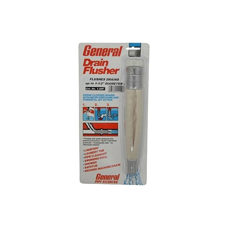Opens clogged drains with water pressure. Just attach to garden hose and slide Drain Flusher into drain. Water expands Flusher to size of pipe. Then water pressure pushes stoppage down the line. Equipped with backflow preventer on the inlet side.