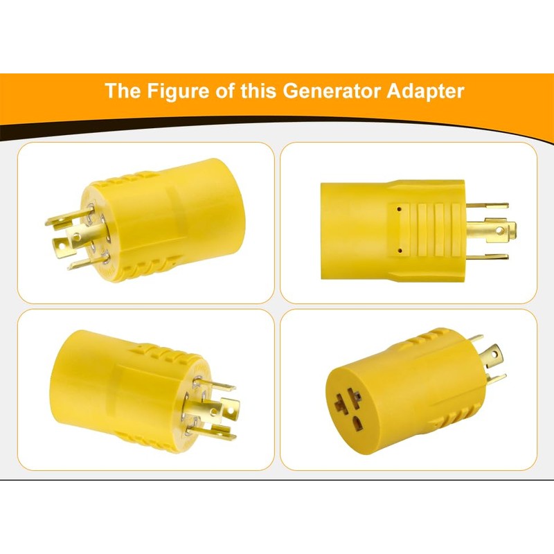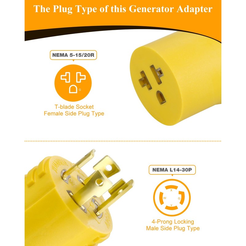 • 【Generator Multi-Function Power Adapter】NEMA L14-30P to NEMA 5-15/20R and NEMA 6-15/20R adapter converts your generator's 30A locking receptacle (L14-30P) to a standard 15A or 20A receptacle (5-15 /20R and 6-15/20R) Plug and play, superior quality control ensures the safety and durability of the power connection, ensuring your travel and home safety. Bright yellow color is not easy to lose. Power Support: 20 Amp Overload Maximum, 250 Volts, 5000 Watts