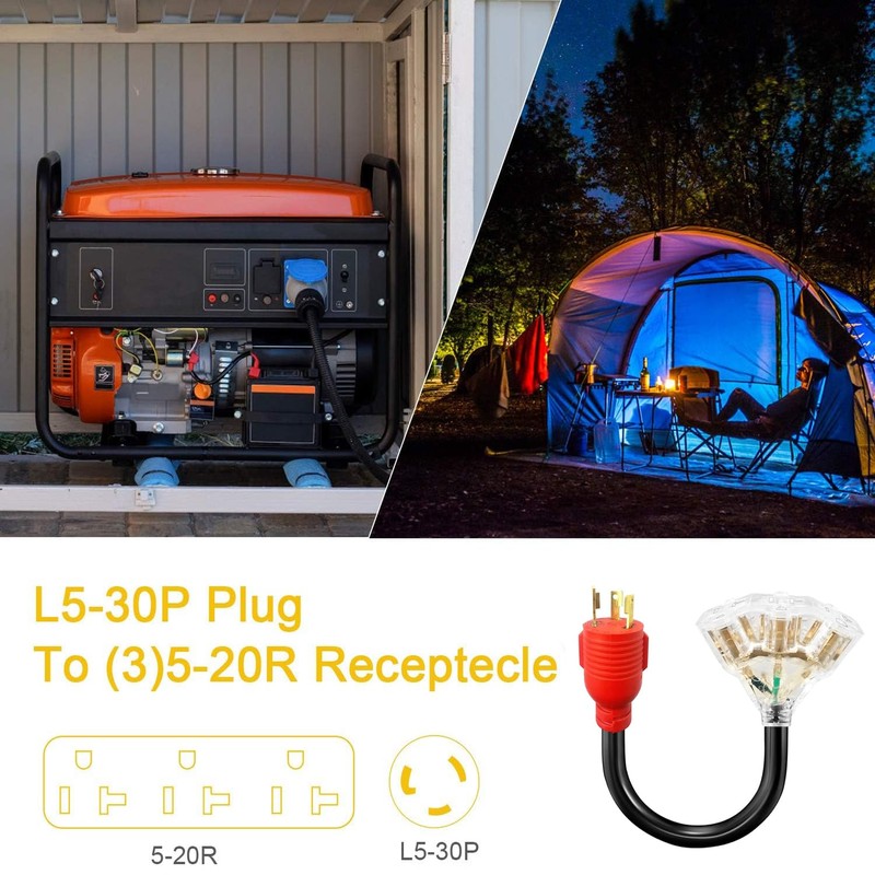 - 【SPECIFICATION】1.7FT Nema L5-30P Male to 5-15R/20R Female Generator RV Adapter Cord maximum 30 Amp overload capacity, rated for 125V, max rate 3750 Watts. with UL certification. 30 amp to 110 adapter suitable for RV, camping, various construction sites, great for emergency power for lighting or projects maintenance