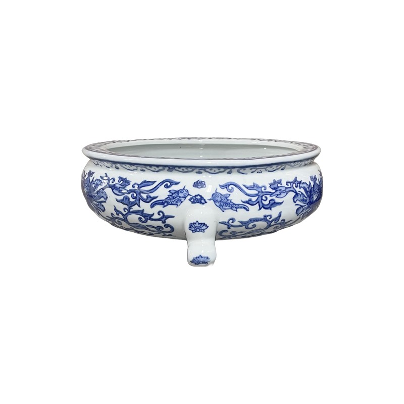 Generic 12"" Diameter Oriental Lotus & Vine Design Blue & White Bamboo Succulent Catus Planter Holder Bowl with Decorative Feet