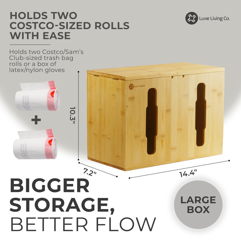 - LARGE CAPACITY Holds two Costco-sized trash bag rolls, grocery bags, gloves, wipes, or tissues. A versatile bag organizer for kitchen organization, pantry storage, or laundry room needs.