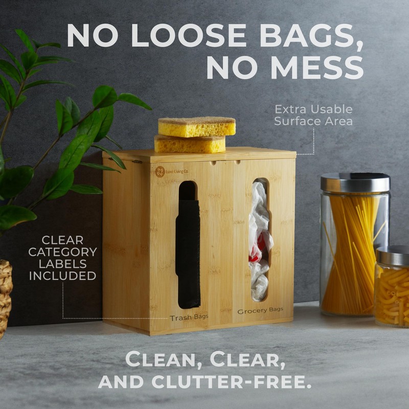 Upgrade your home with the ultimate plastic bag holder and trash bag dispenser designed for modern organization and storage kitchen needs. Unlike standard plastic bag holders for grocery bags, this unit features a solid flat lid that doubles as extra storage or a stackable surfaceperfect for maximizing space in tight areas.Built with large capacity storage, it accommodates two Costco-sized 13-gallon trash bag rolls, a box of gloves, tissues, wipes, grocery bags, compost bags, or recycling liners. It's a bag organizer and garbage bag dispenser in one, making it one of the kitchen must haves 2025.With dual mounting options, it installs as an under sink organizer kitchen, wall-mounted cabinet organizer, or over the door under sink storage organizer. The upgraded 1.18" padded hooks ensure a secure, scratch-free fit on most cabinet doors, transforming wasted space into efficient kitchen cabinet storage or under cabinet organizer solutions.This sleek unit enhances pantry organizers and storage, laundry room organization, or under kitchen sink organizers and storage while blending seamlessly with any laundry room decor. It's ideal as a pantry storage solution, trash cabinet helper, or part of your laundry room accessories and laundry organizers and storage setup.The magnetic closure lid and dual dispensing design make access easy, while included labels keep your bag storage organizer customized and clear. Use it for kitchen, bathroom, garage, or office essentialswherever clutter needs taming.A versatile addition to any home, this is not only a smart kitchen pantry organizer but also belongs on your list of wedding registry must haves and laundry accessories for 2025. Simplify your life with a durable, stylish, and functional trash bag organizer and bag holder for plastic bags groceries storea true upgrade in organization and storage kitchen solutions.