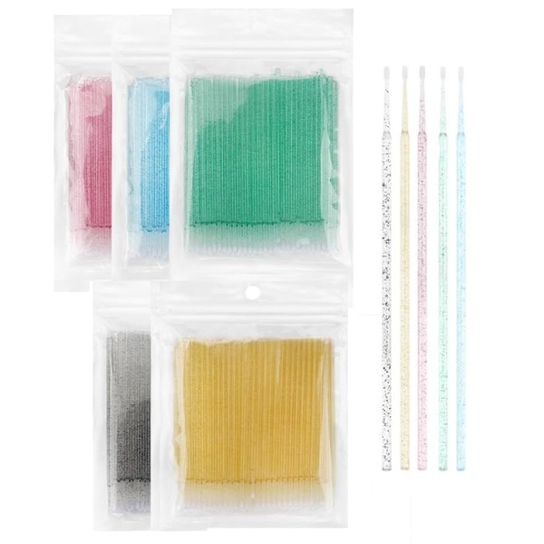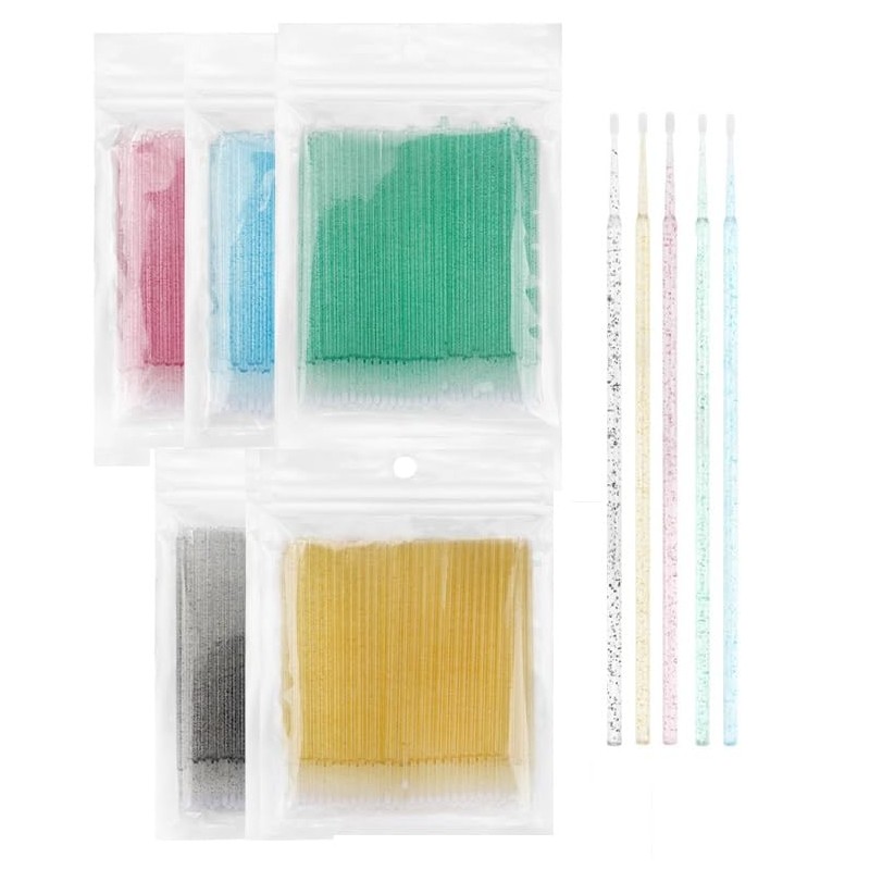 Brush set 500 Pcs colors: 100 Pink, 100 Blue, 100 Gold, 100 Crystal, 100 Green These microswabs are essential tools for eyelash extension upkeep. Ideal for removing excess lash glue or dead lashes, their ultra-fine tips allow for precise cleaning without damaging healthy extensions. Packaged with 100 replacement brushes, this set provides everything needed to gently tidy lashes between salon visits. The brushes lay down in a convenient storage box for easy access. Whether maintaining professional lash extensions or DIY lash lifts at home, these micro applicators do the job without irritation. Their compact size fits perfectly in makeup bags too for touch-ups anytime, anywhere.