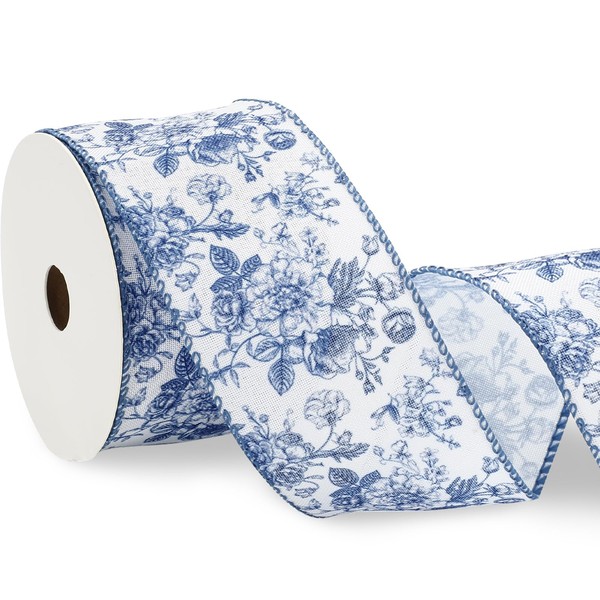 Generic AnyDesign Floral Wired Edge Ribbon Blue Flower Craft Ribbon Chinoiserie Decorative Fabric Ribbon for DIY Crafts Wreath Bow Making, 12 Yards