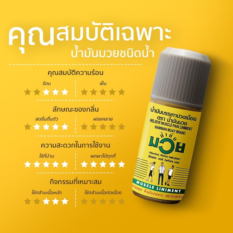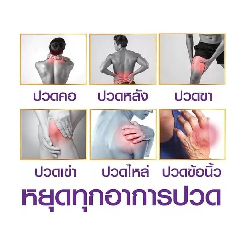 Oil relieves aches and pains It's a common home medicine. Apply, rub, massage to relieve aches, sprains, bruises, tight muscles, bruises, black and green skin. Suitable for athletes or those who use heavy muscles How to use: Shake the bottle up and down. Let the medicine mix well before using. ? For external use only ? Packing size: 30 cc, 60 cc, 120 cc Registration number G516/60