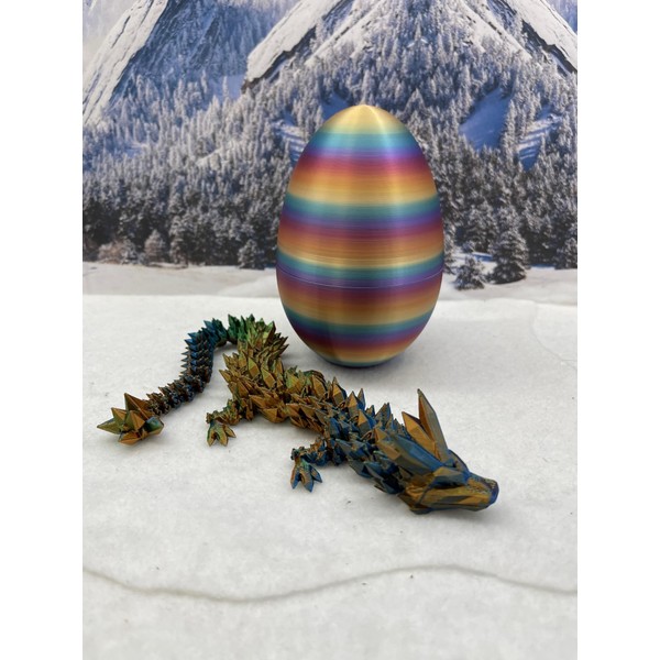 3D Printed enchanting Articulated Crystal Blossom Dragon - a mystical creature that brings a touch of fantasy to your world. Unveil the mystery of the Nebula Dragon Egg and this tri color Crystal Dragon ( measures approximately 12" long) a captivating fusion of elegance and fantasy. Encased within a meticulously designed crystal egg, this tiny dragon reveals itself with a symphony of colors - a testament to its magical heritage. ------- Choking Hazard Small Components Advisory NOT for Children under 3 years old: ------- Please note that this product may contain small components and might not be suitable for very young children. Given the characteristics of 3D printing, there is a potential for small components to detach if handled aggressively or dropped. Therefore, we advise against allowing younger children to interact with the dragon. Please consider that 3D printed objects might include minor imperfections such as layer lines. These are a natural and inherent aspect of the printing process. We strive to produce the highest quality items, and these imperfections contribute to the unique character of each piece. Recall the unique creation of each dragon, crafted exclusively for you. The color selections available are depicted in the provided photos. Please be aware that variations in color may occur due to discrepancies in filament production and the characteristics of the monitor or screen you are utilizing to view the listing. Additionally, the arrangement of prints using multi-colored filament rolls can influence color distribution. ------- Licensing Information: ------- Authorized Design: NOHo3D holds the official authorization for the production of this exquisite design created by CinderWing3D.