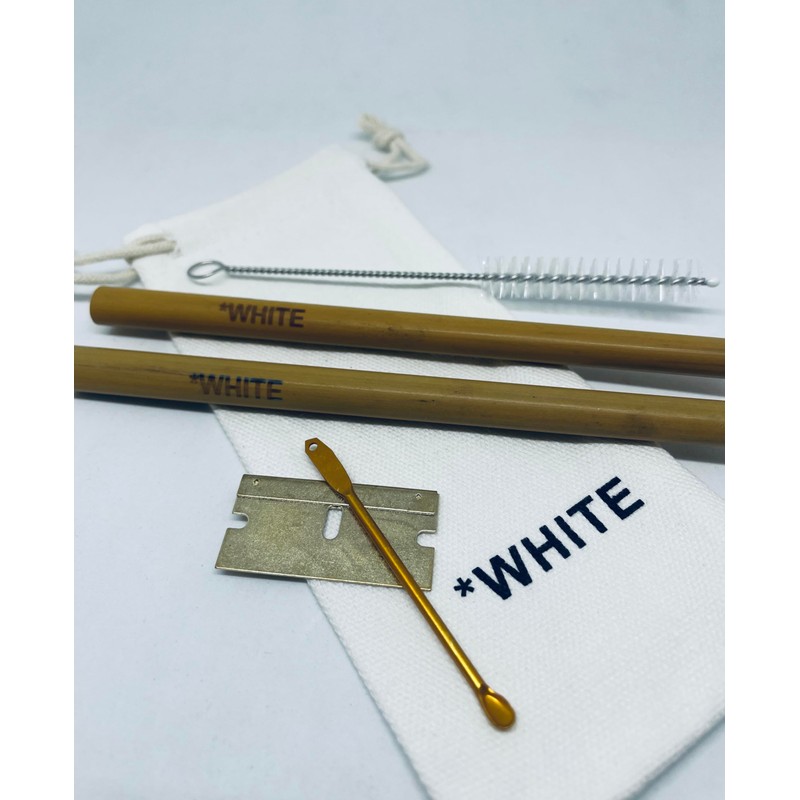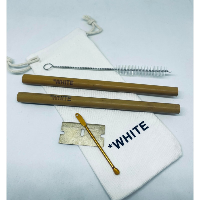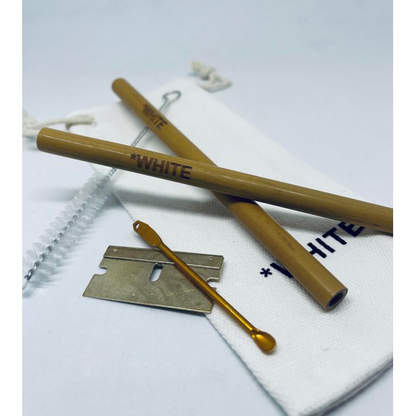 A complete set of 2 bamboo straws with cleaning brush, gold snuff spoon and chopper; all in a neat drawstring bag. Get the set!