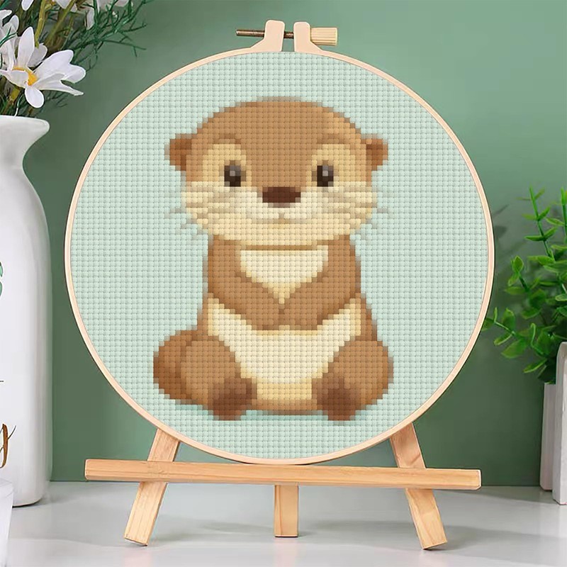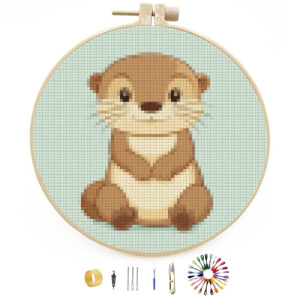 Generic Cartoon Cute Otter Easy Stamped Cross Stitch Kit for Beginners with Hoop Simple Patterns 11CT Counted Embroidery Needlepoint Crafts Arts for DIY Enthusiasts and Home Decor 26x26cm
