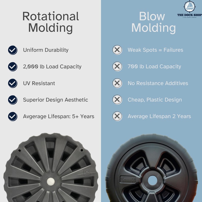 - 🌀 ROTATIONALLY MOLDED PRODUCTION: Perfectly sized for a 1.5” schedule 40 galvanized pipe to act as the axle, this wheel offers a seamless fit for your docking setup. Hardware requirements can vary, providing flexibility for different dock configurations.