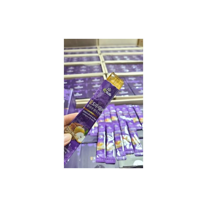 - Ingredients: Bellflower 30%, Calcium Seaweed 0.5%, Fish Collagen 10%, Honey 5%, Mountain Ginseng, Pear concentrate 80%